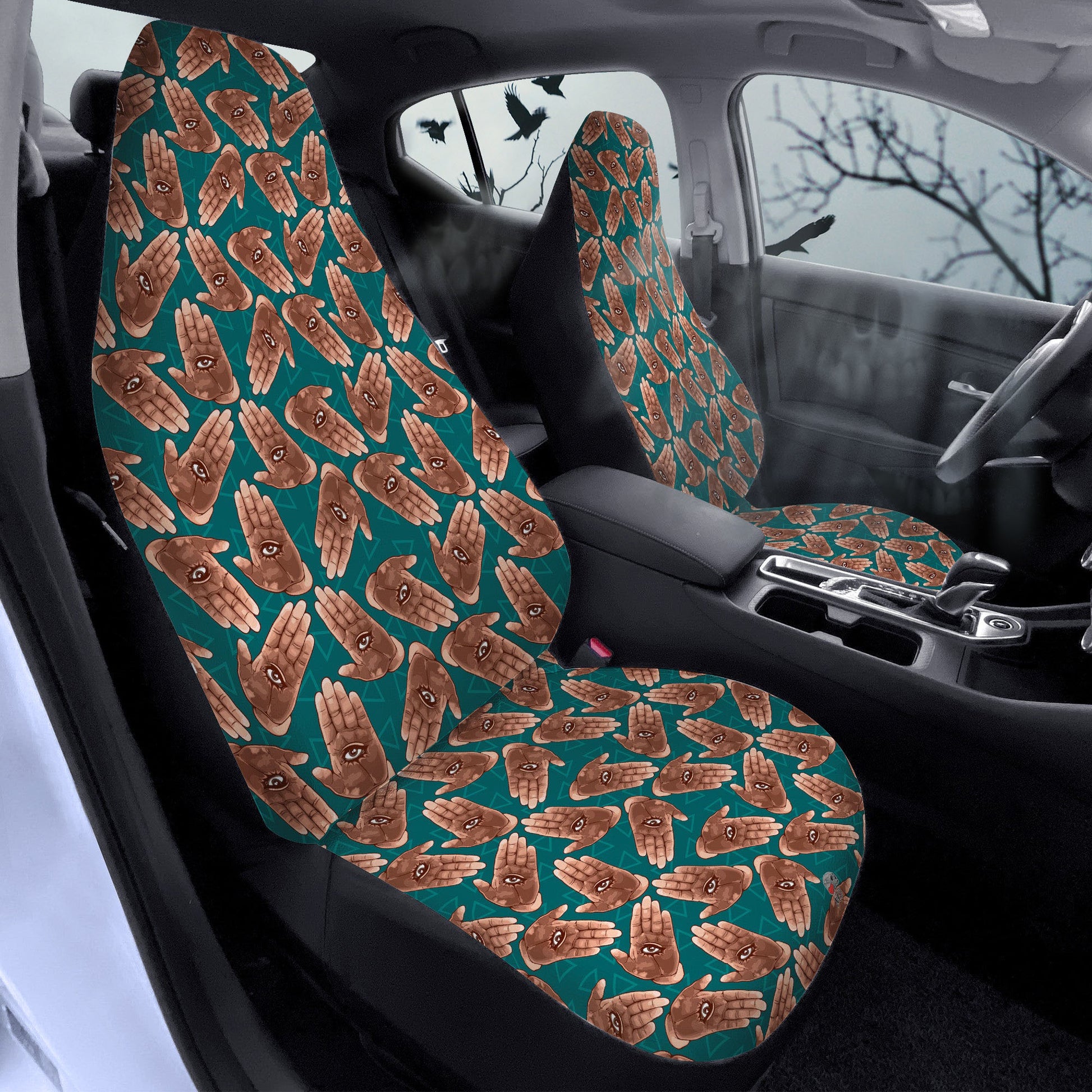 All-seeing palm car seat covers feature Exclusive, original artwork by NeoSkull inspired by occult art aesthetics. Each item is individually printed, cut, and sewn to ensure a flawless graphic with no imperfections. Perfect addition to your horrid car look.