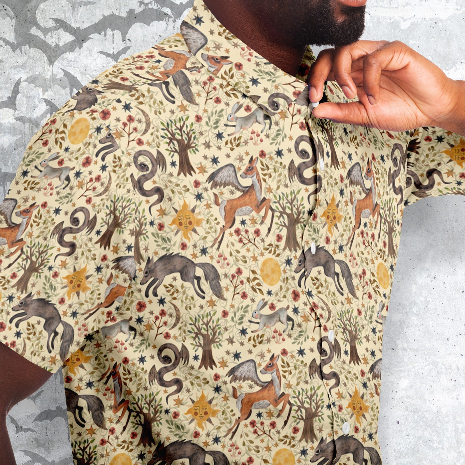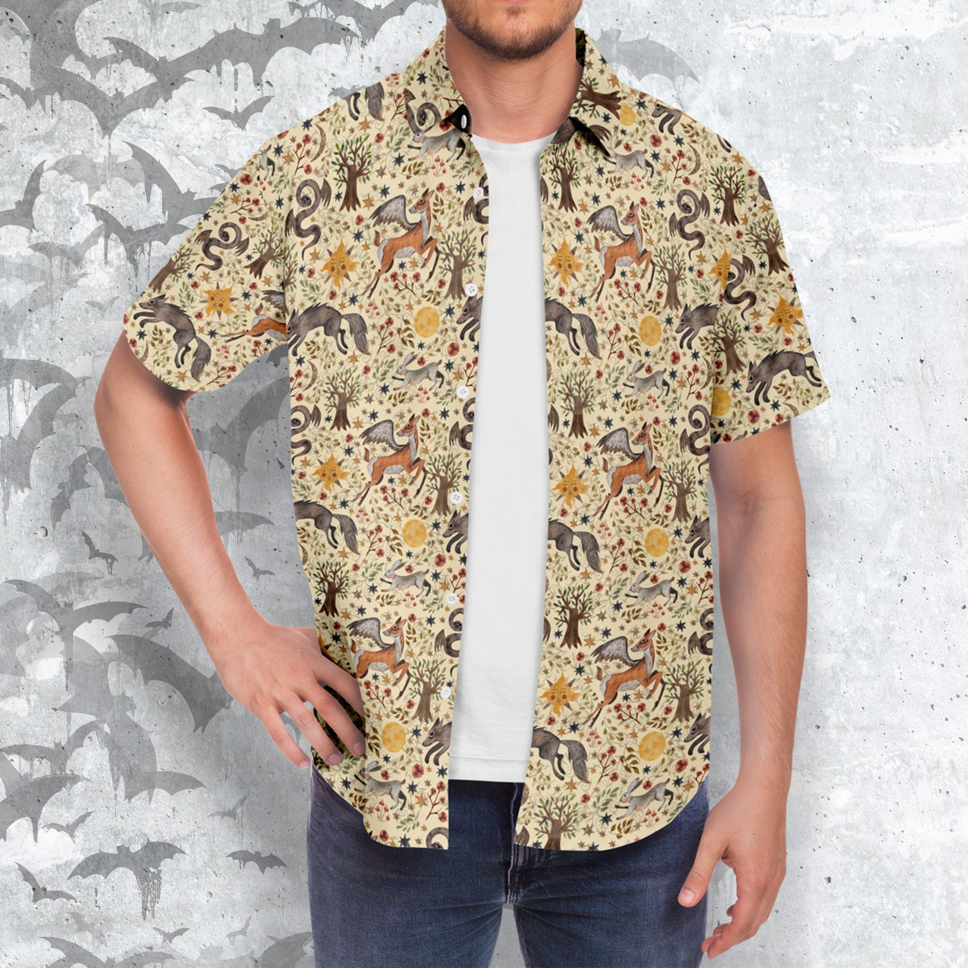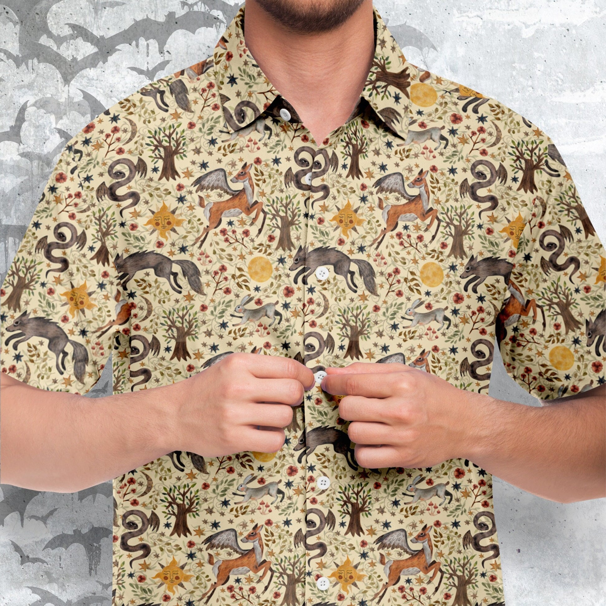Discover the magic of our Dark Fairytale Short Sleeve Button-Up Shirt. This unique garment is designed to transport you into the mystical realm of dark fairytales. Perfect for those who love to embrace the enigmatic and whimsical, this shirt is a statement piece for any occasion, from special gatherings to casual outings.