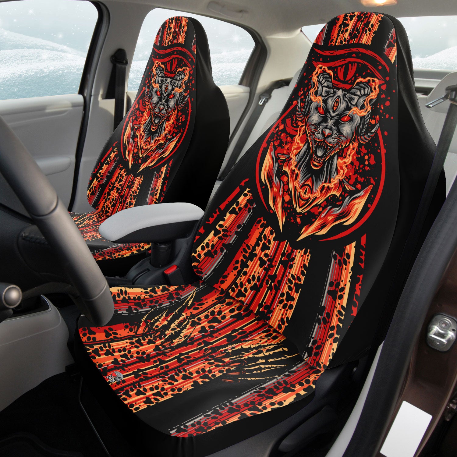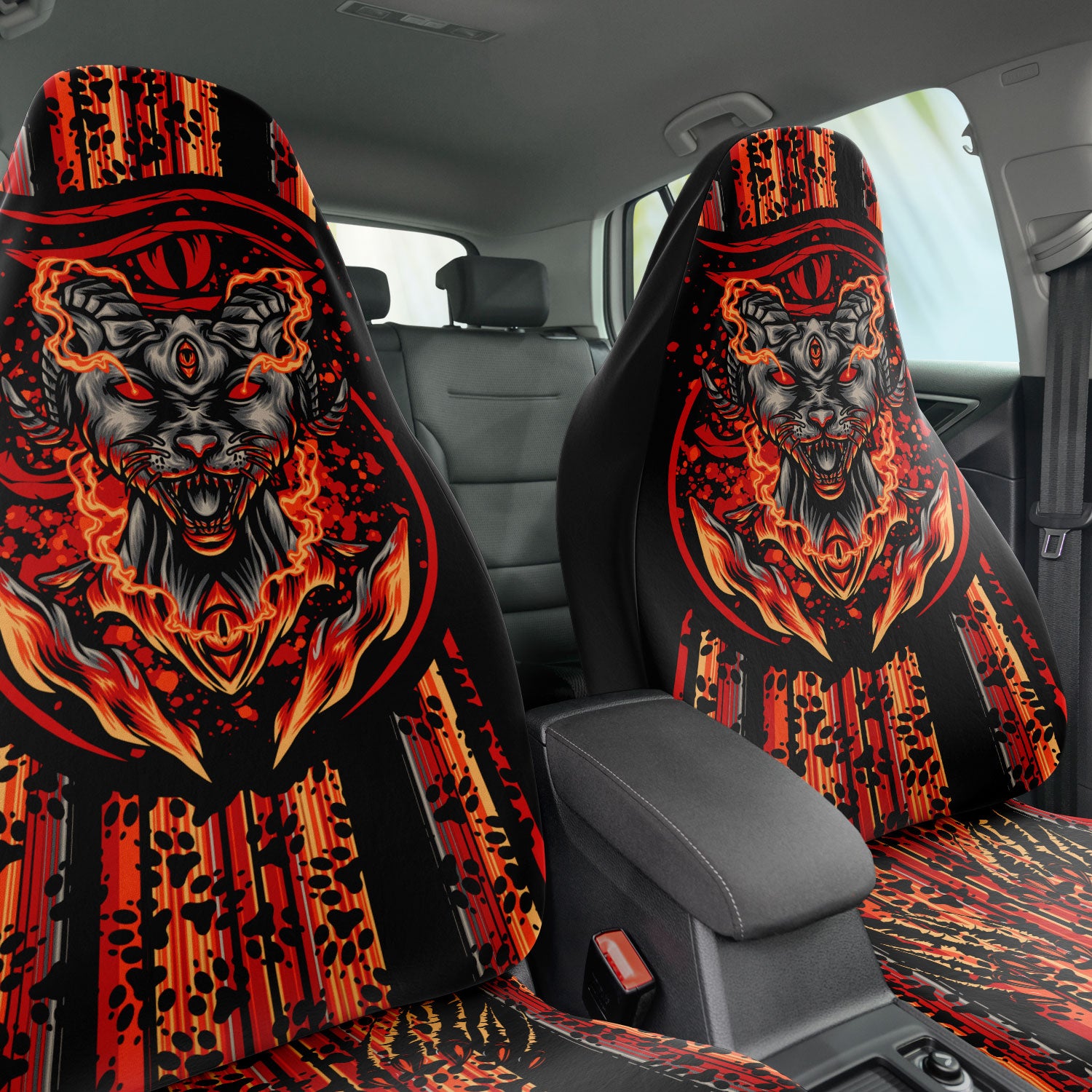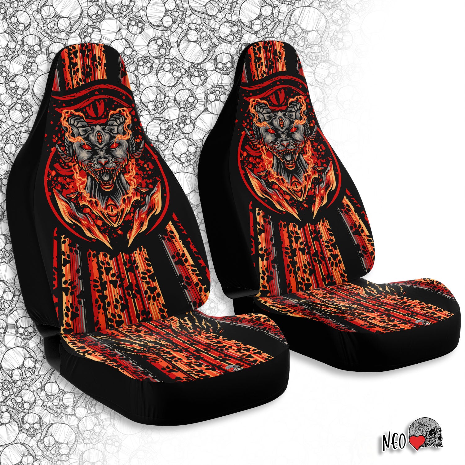 Egyptian satanic cat Car seat Covers feature Exclusive, original artwork by NeoSkull inspired by pastel goth aesthetic. Each item is individually printed, cut, and sewn to ensure a flawless graphic with no imperfections. Perfect addition to your edgy girl car look.
