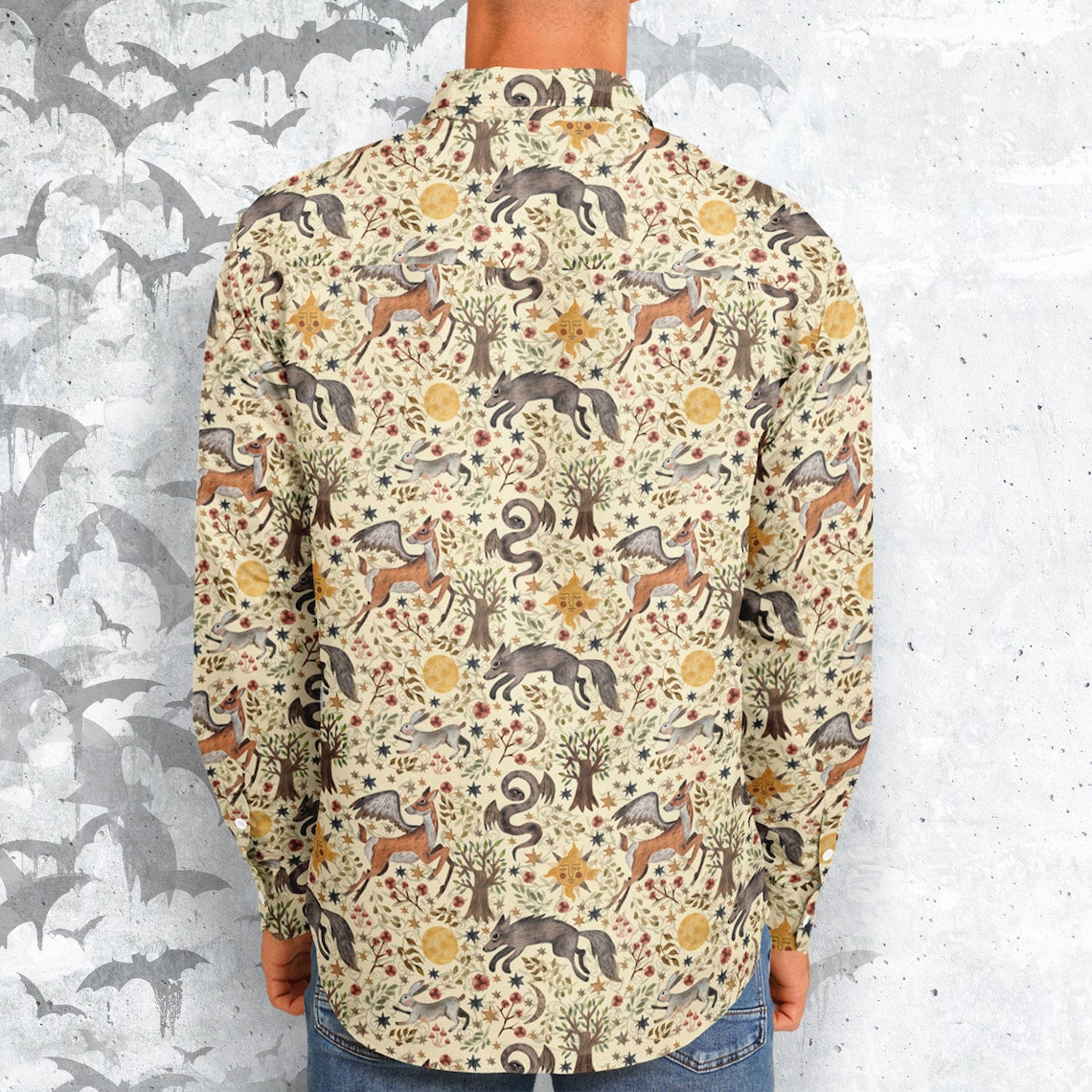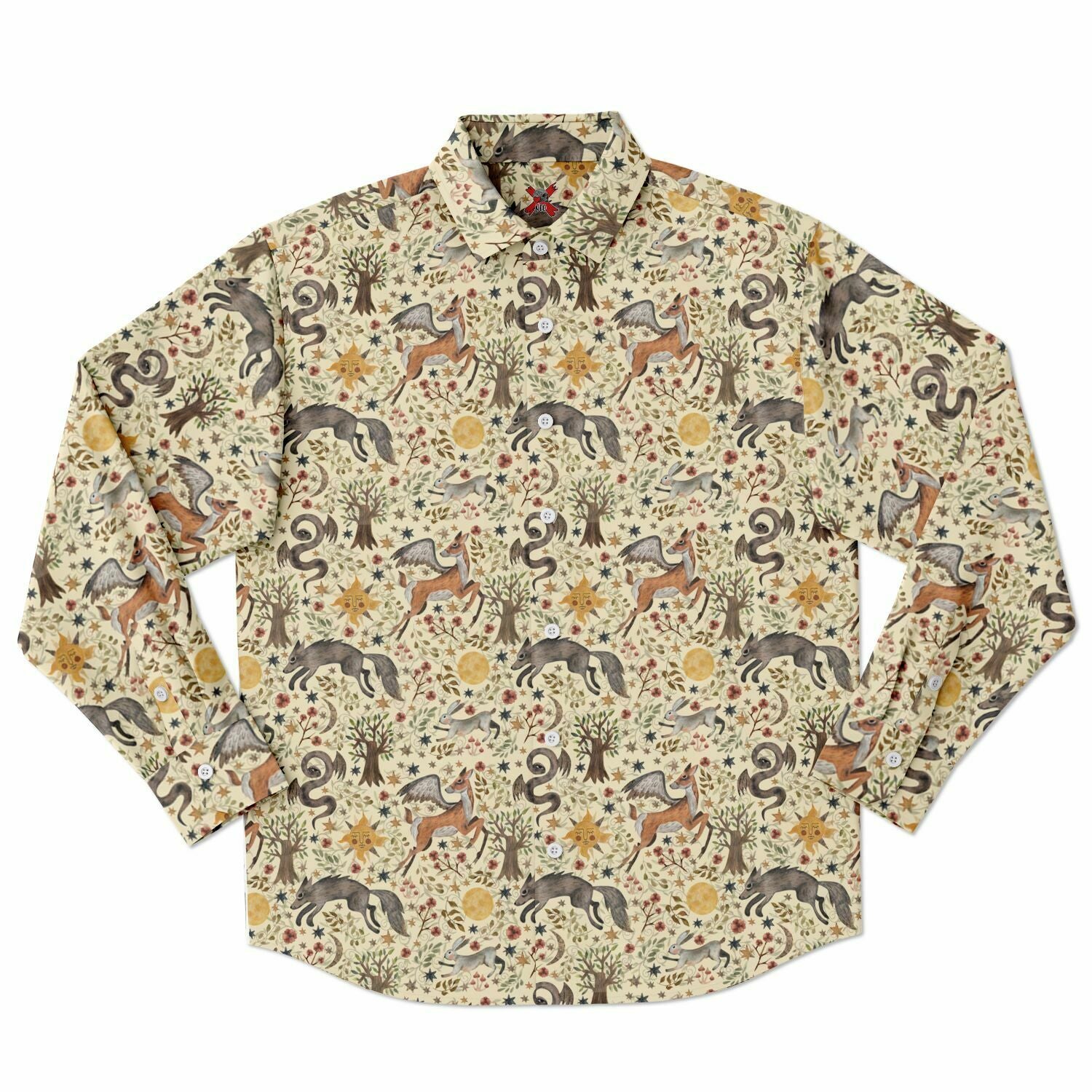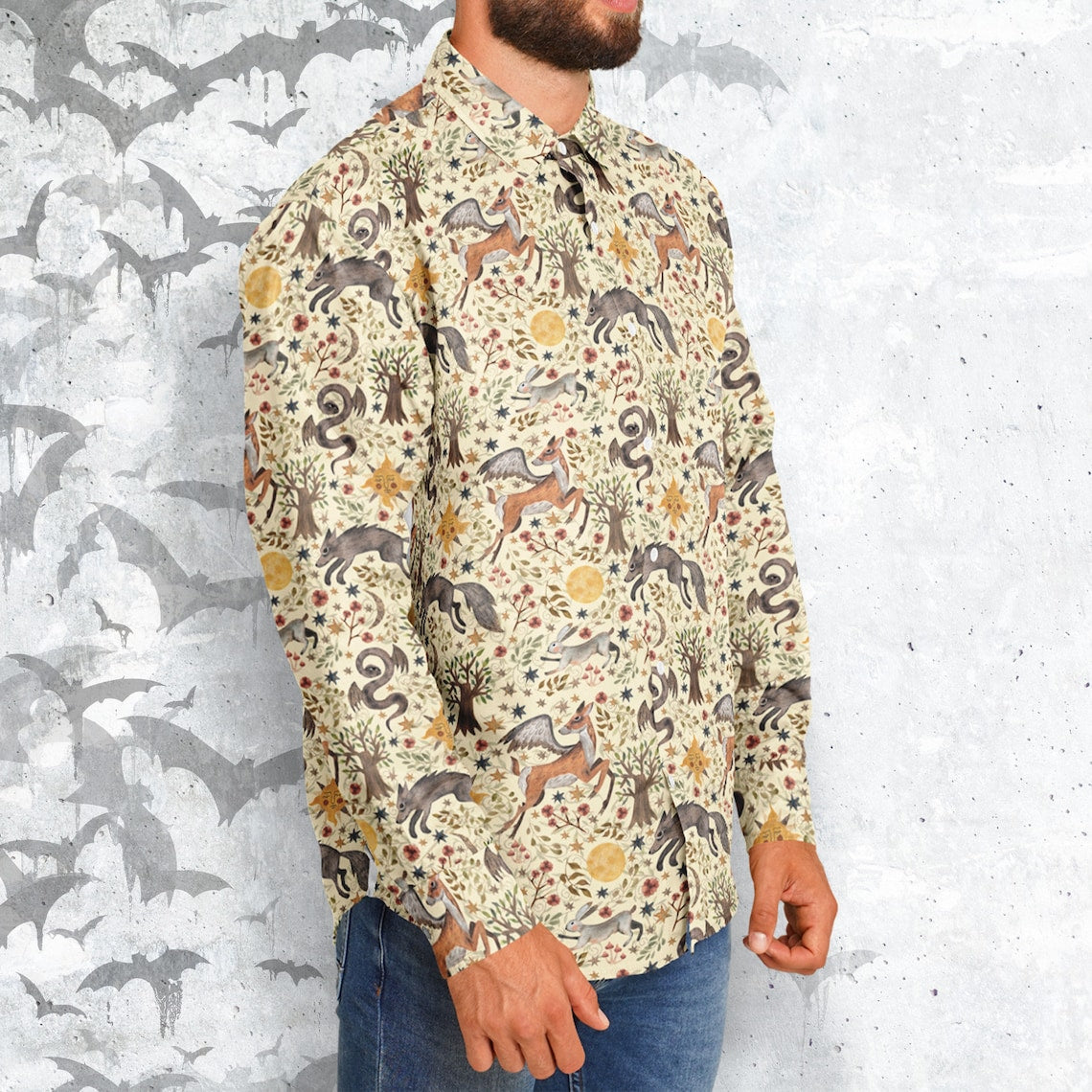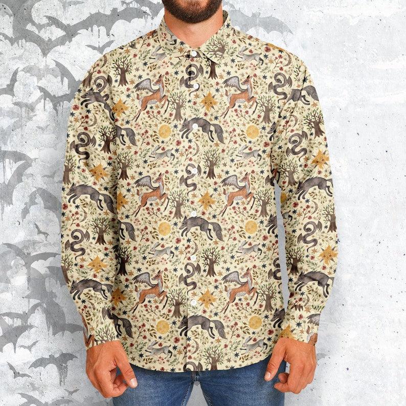 Stay cool with this fun printed long-sleeve button-up shirt. It comes in regular width and spread collar. Perfect for those dressier hot days. Always up-to-date Mystical Clothing.