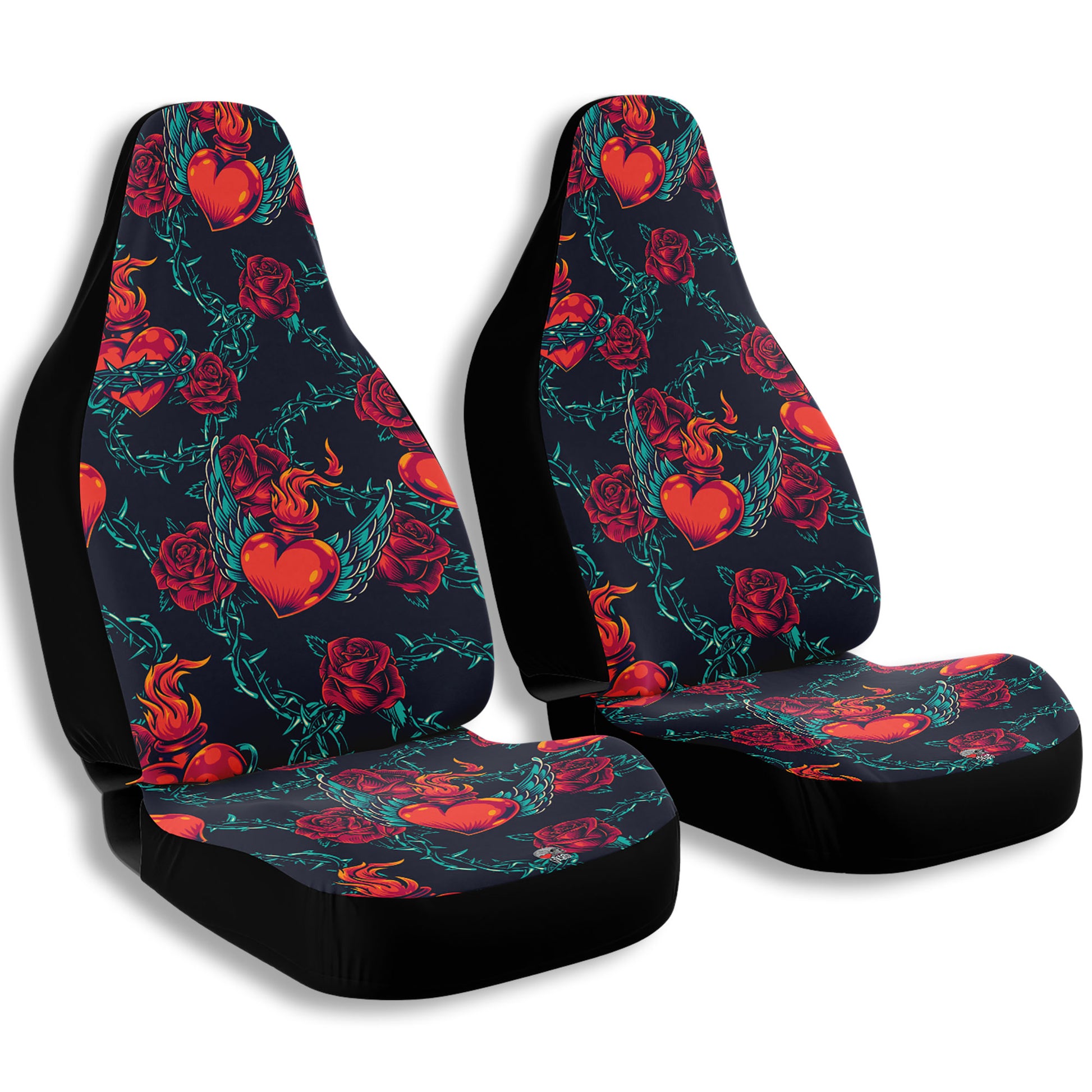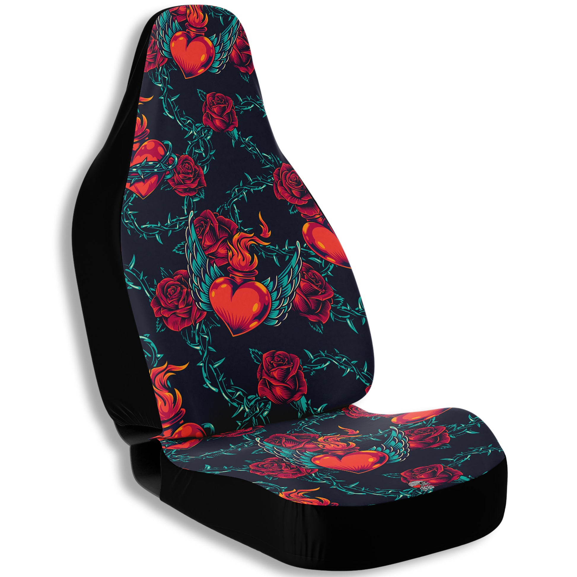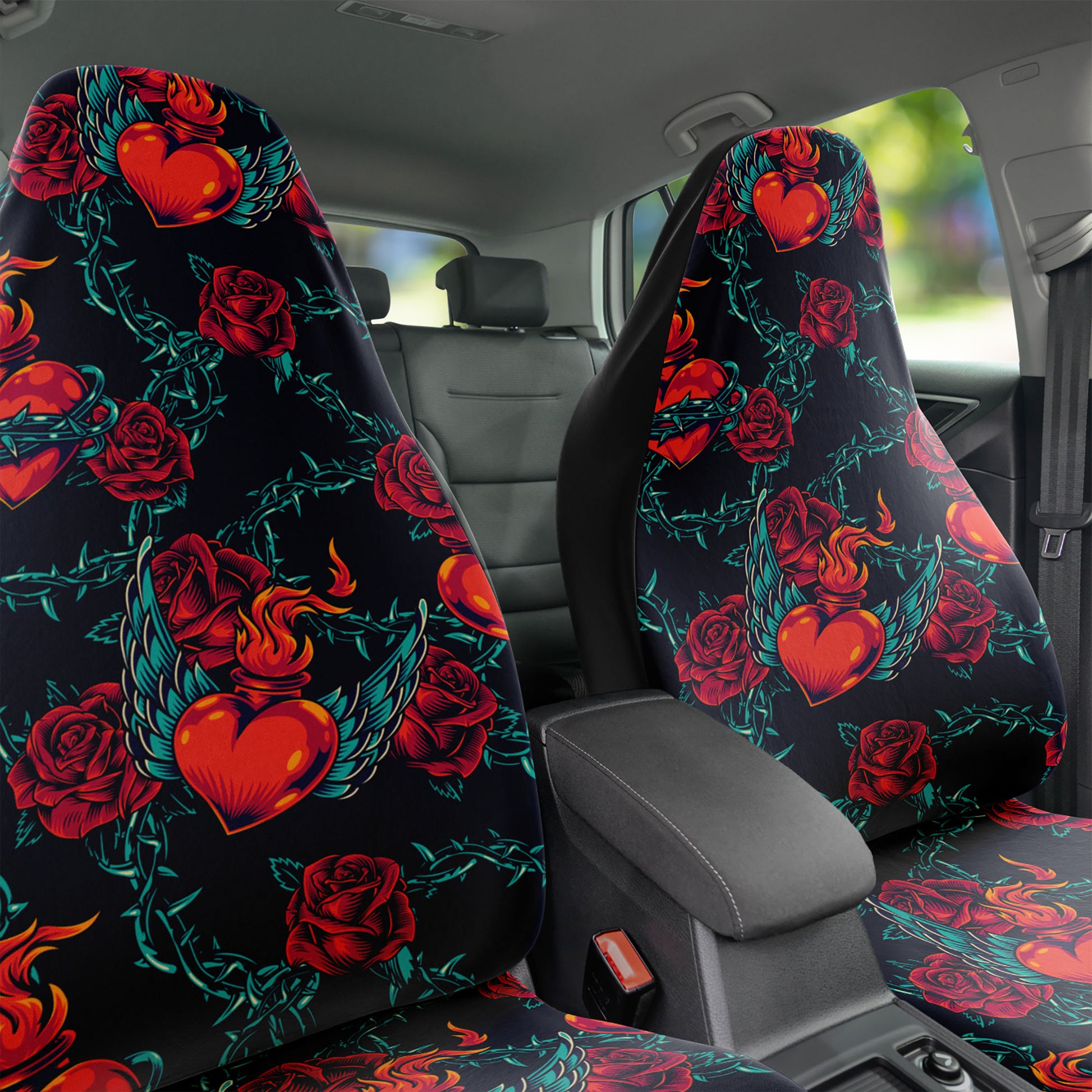 Fiery Hearts Roses and thorns Car seat Covers feature Exclusive, original artwork by NeoSkull inspired by gothic aesthetic and tattoo art. Each item is individually printed, cut, and sewn to ensure a flawless graphic with no imperfections. Perfect addition to your horrid car look.