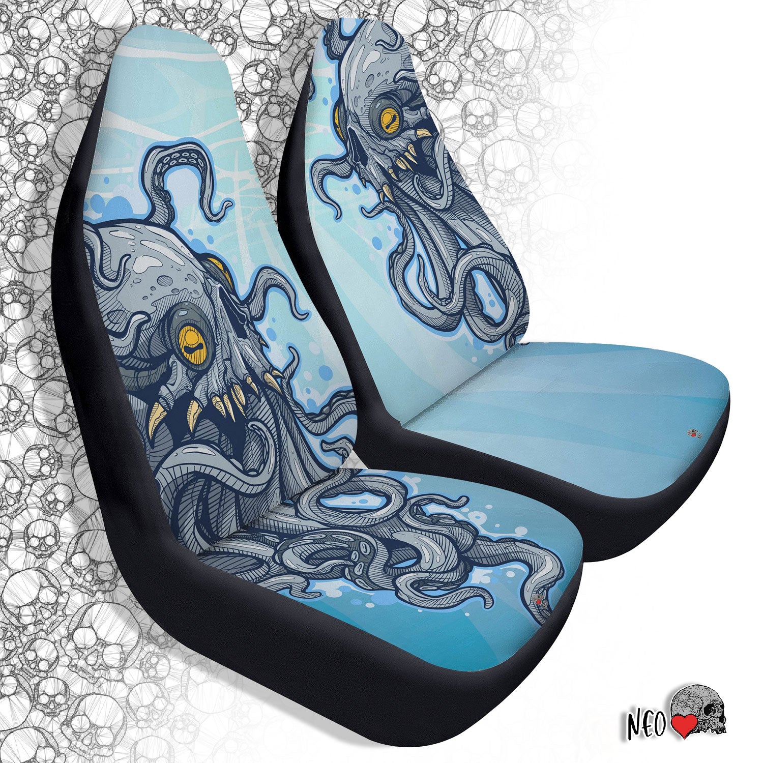 Kraken seat Covers feature Exclusive, original artwork by NeoSkull inspired by cartoon horror aesthetic. Each item is individually printed, cut, and sewn to ensure a flawless graphic with no imperfections. Perfect addition to your horrid car look.