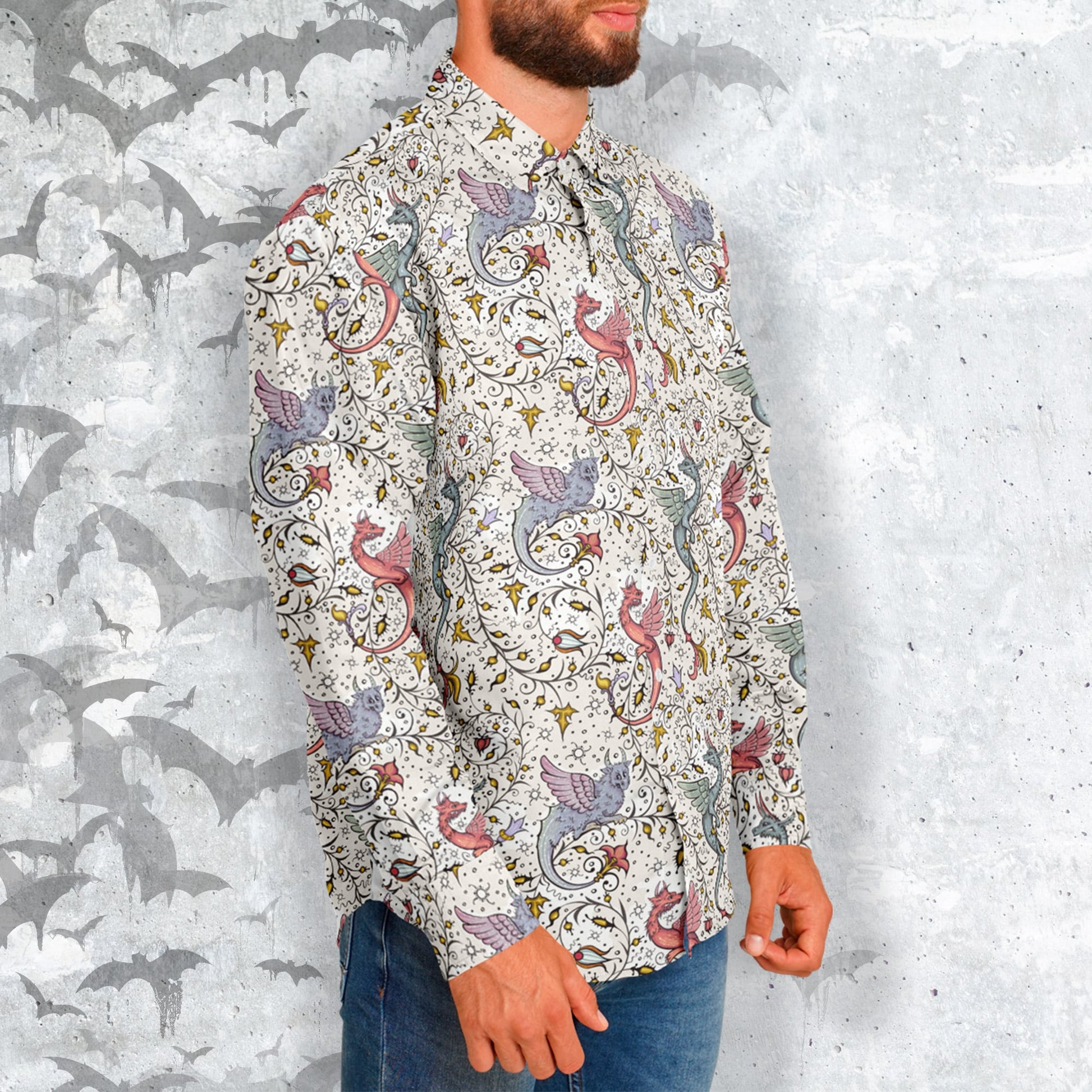 Stay cool with this fun printed long-sleeve button-up shirt. It comes in regular width and spread collar. Perfect for those dressier hot days. Always up-to-date Mystical Clothing.