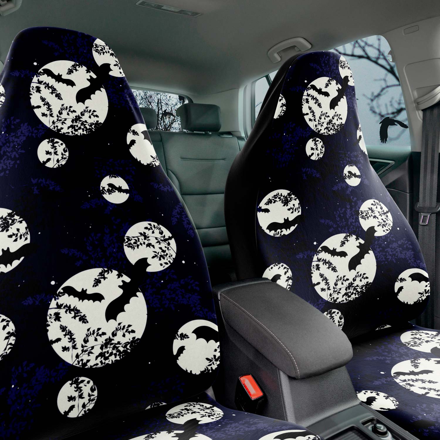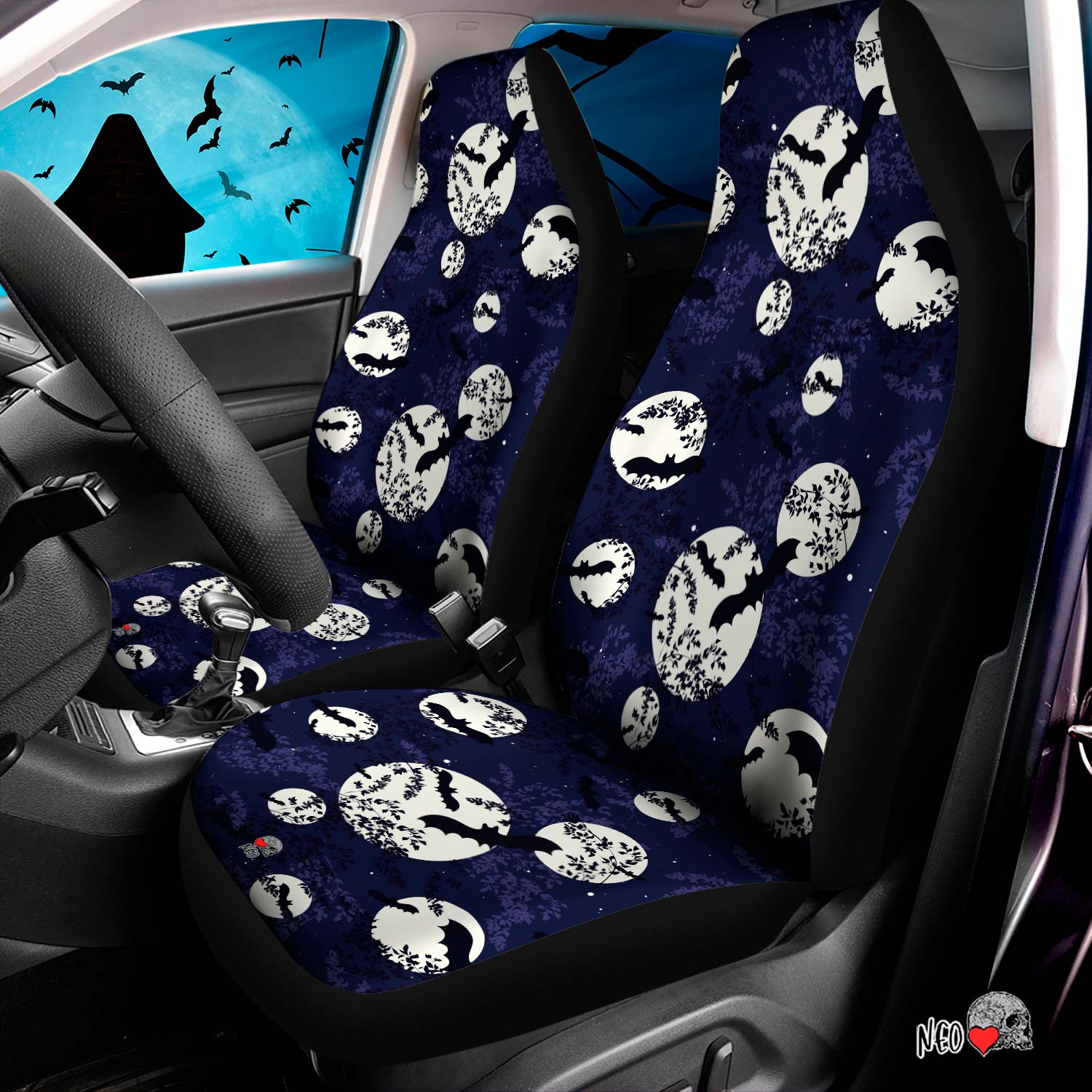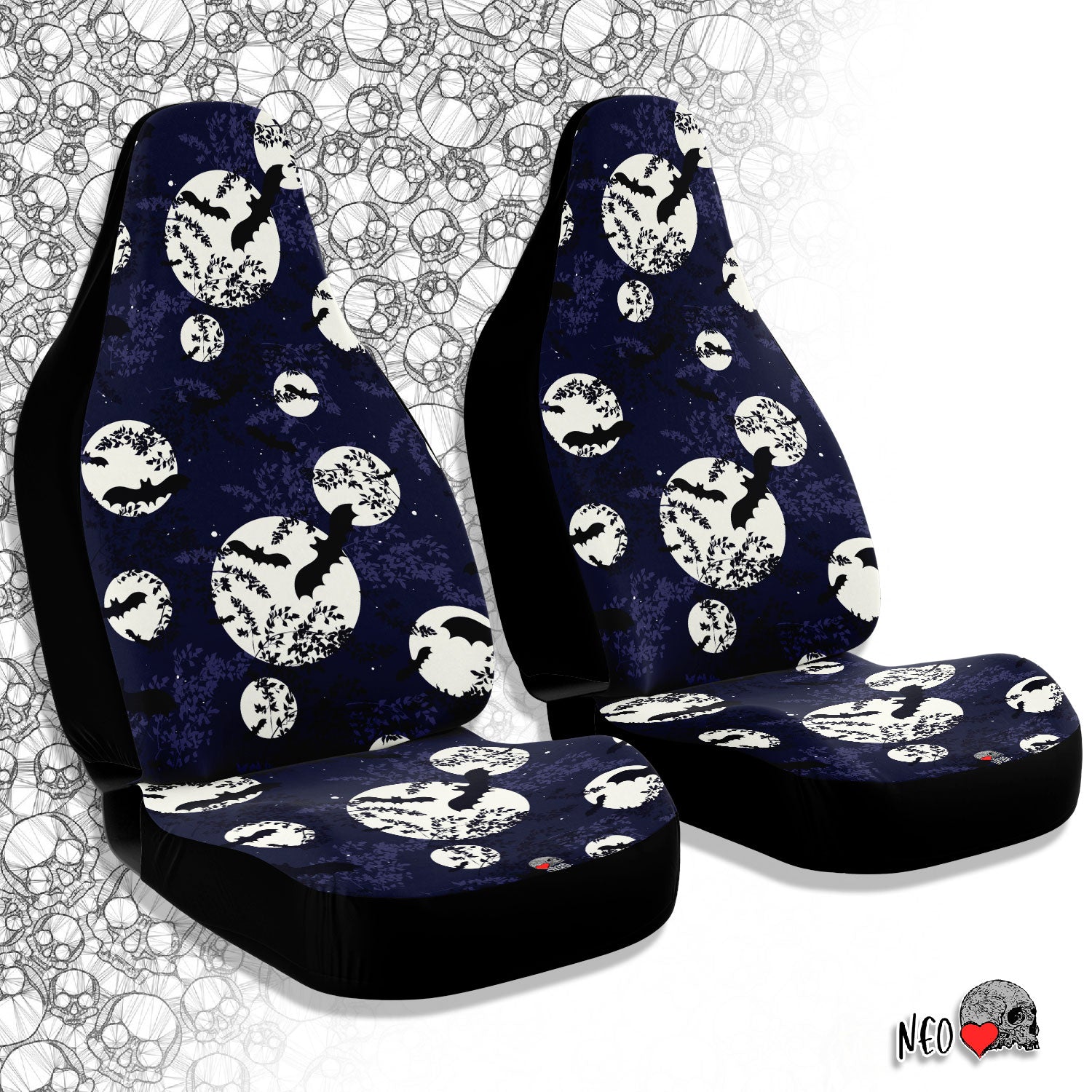 Night sky and bats Car seat Covers feature Exclusive, original artwork by NeoSkull inspired by pastel goth aesthetic. Each item is individually printed, cut, and sewn to ensure a flawless graphic with no imperfections. Perfect addition to your edgy girl car look.