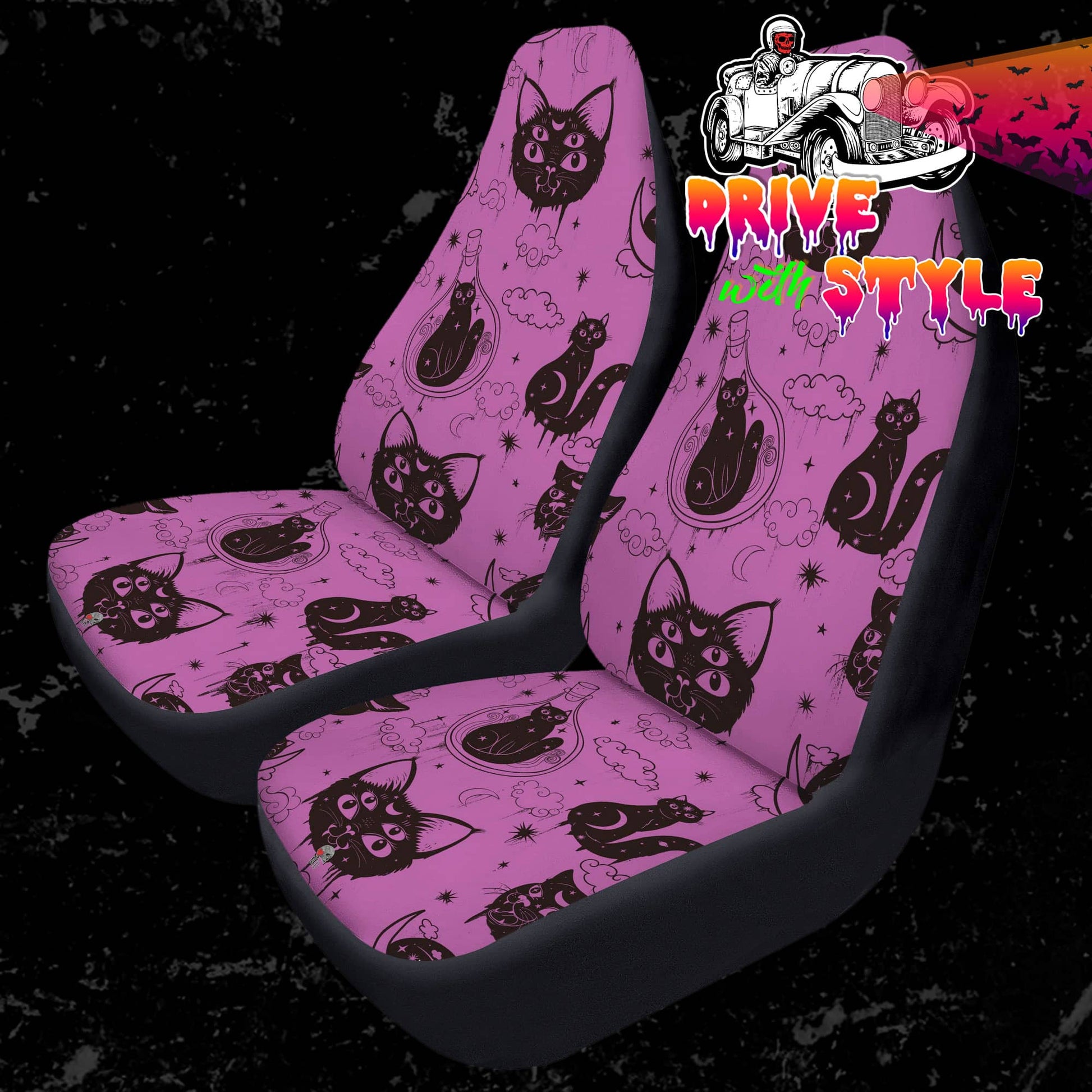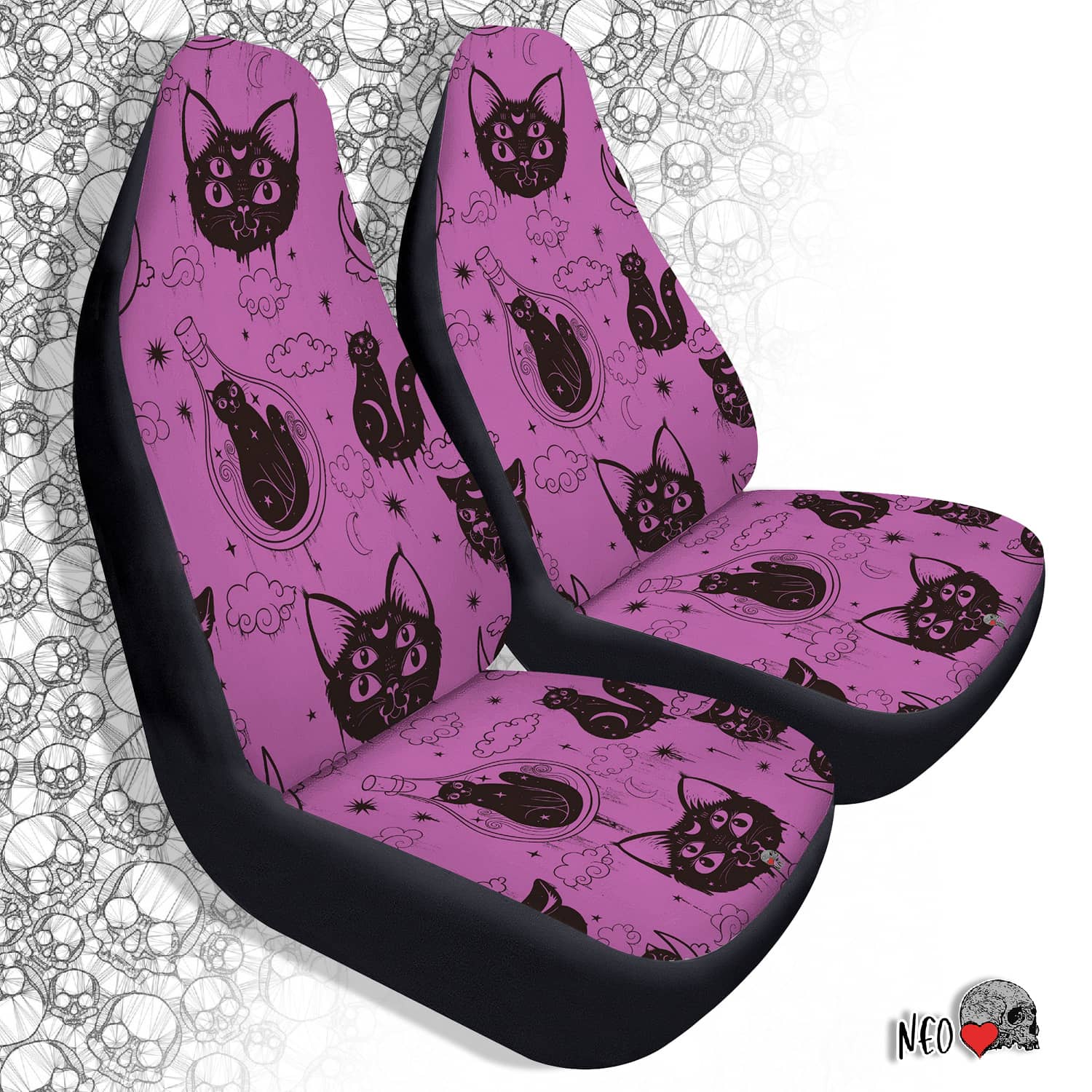 Occult Cat car seat covers feature Exclusive, original artwork by NeoSkull inspired by witchy art aesthetics. Each item is individually printed, cut, and sewn to ensure a flawless graphic with no imperfections. Perfect addition to your horrid car look.