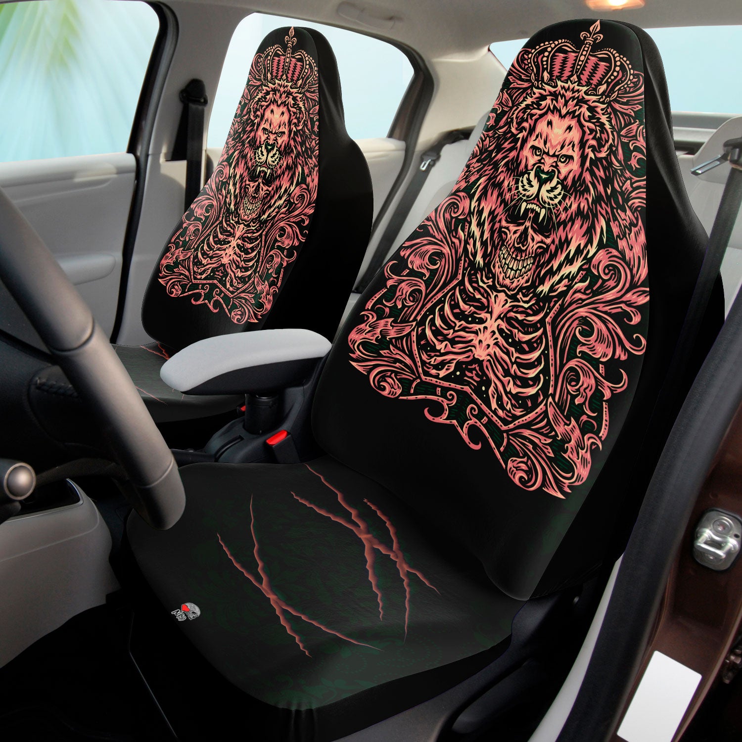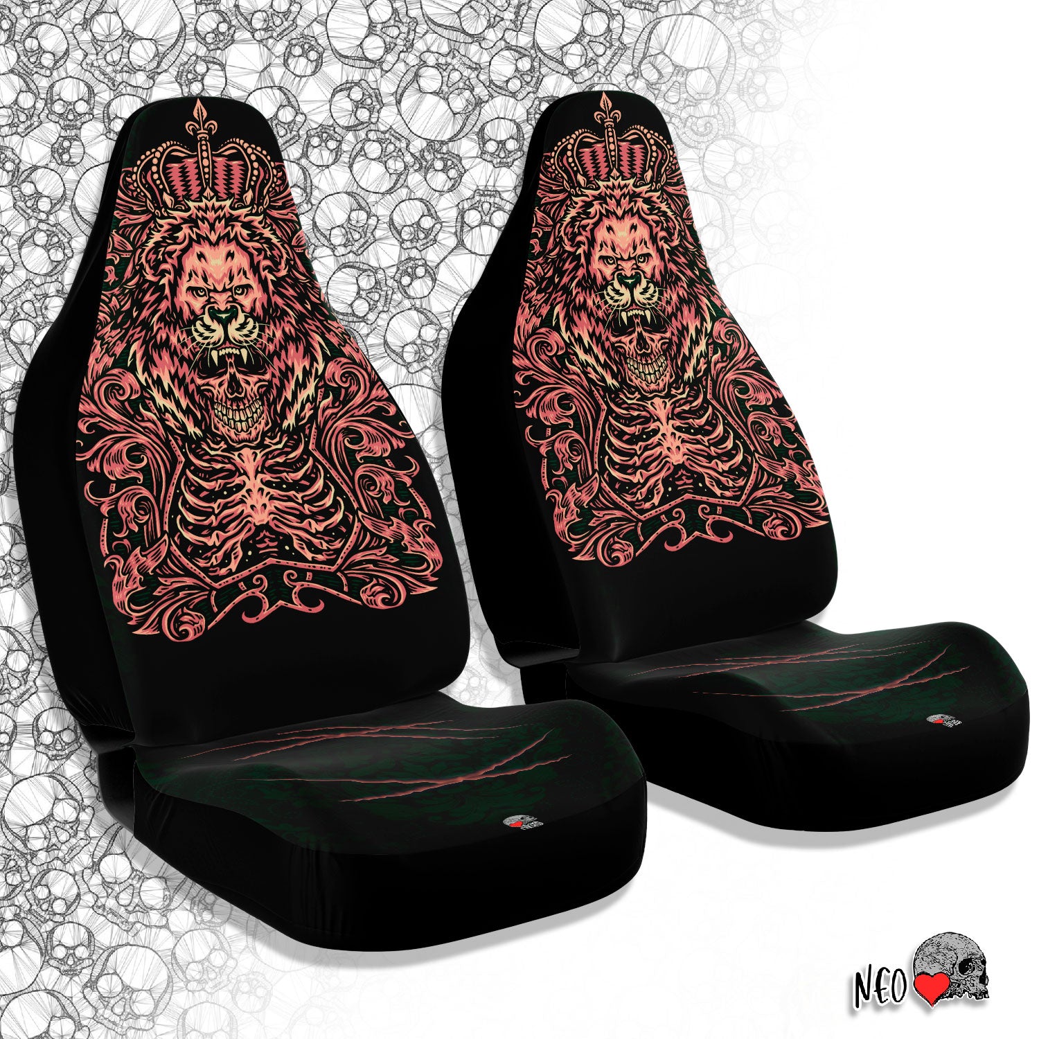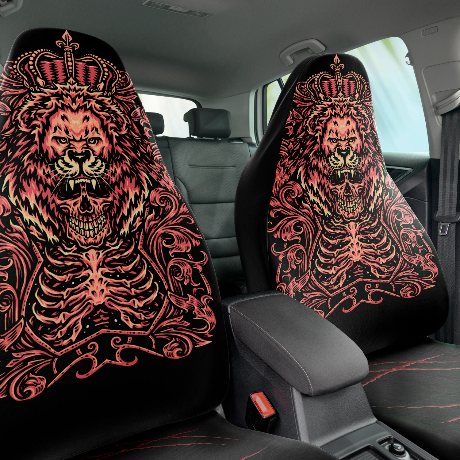 Skull lion king Car seat Covers feature Exclusive, original artwork by NeoSkull inspired by goth aesthetic. Each item is individually printed, cut, and sewn to ensure a flawless graphic with no imperfections. Perfect addition to your original car look.