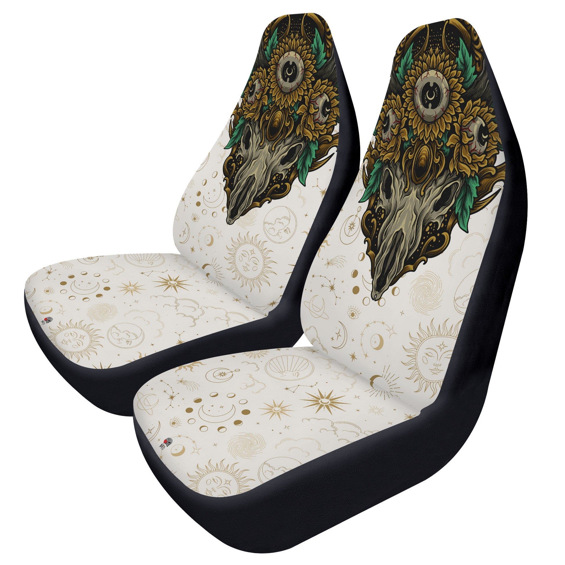 Sunflowers and Deer skull car seat covers feature Exclusive, original artwork by NeoSkull inspired by celestial and occult aesthetics. Each item is individually printed, cut, and sewn to ensure a flawless graphic with no imperfections. Perfect addition to your horrid car look.