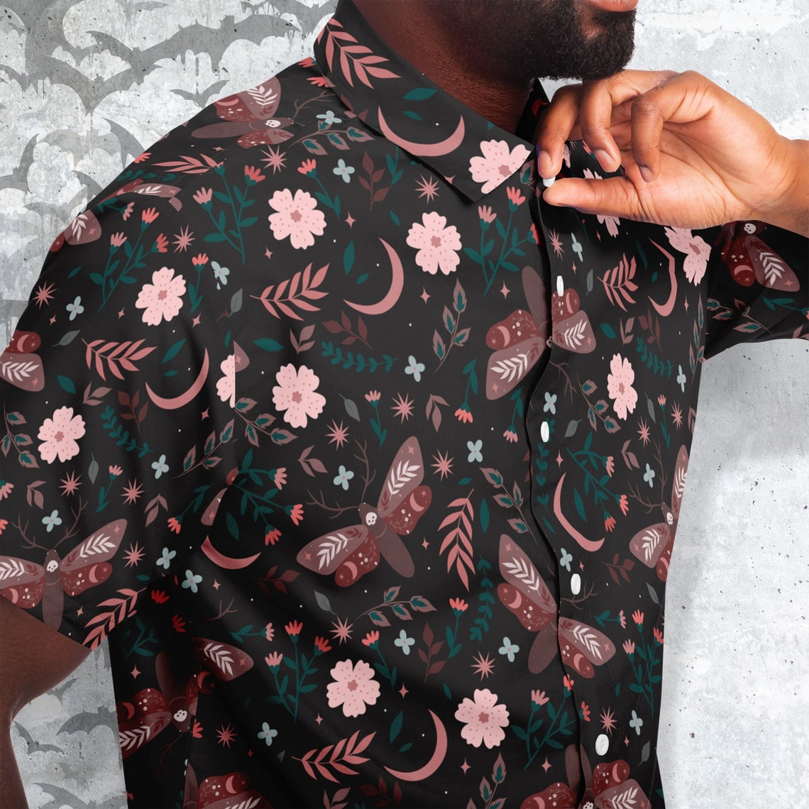 Channel your cosmic energy with this whimsical button-up shirt featuring mystical moths dancing among enchanted flowers. Designed for free spirits who find magic in nature's smallest wonders, this piece celebrates the intersection of botanical beauty and spiritual vibes. The playful imagery invites you to embrace your witchy aesthetic while staying grounded in the natural world. Perfect for rituals, gatherings, or simply radiating good intentions wherever you roam.